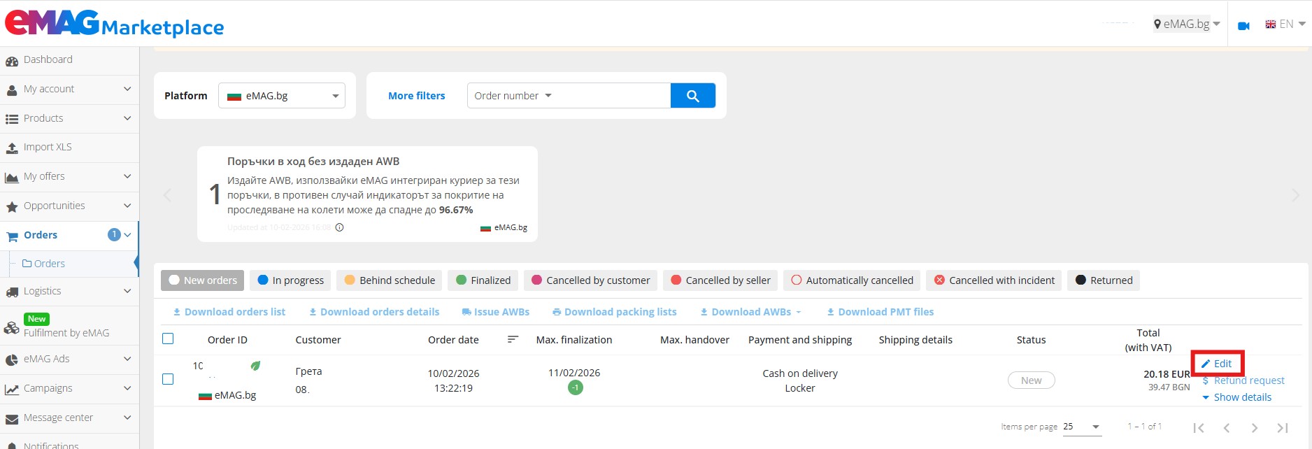 To process an order received on the eMAG Marketplace platform, access the Orders section from the Dashboard. All new orders will be displayed here.