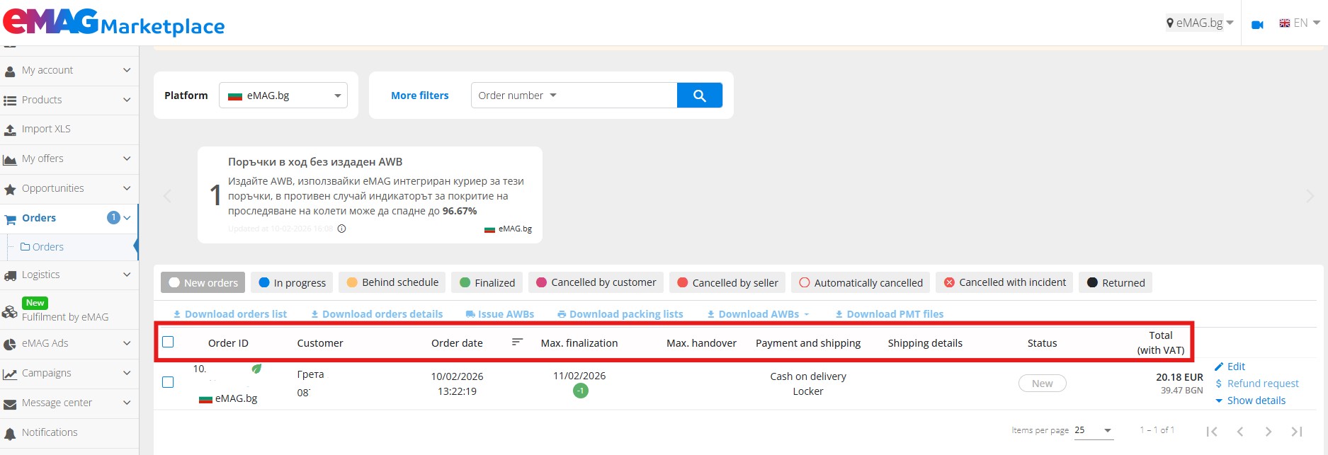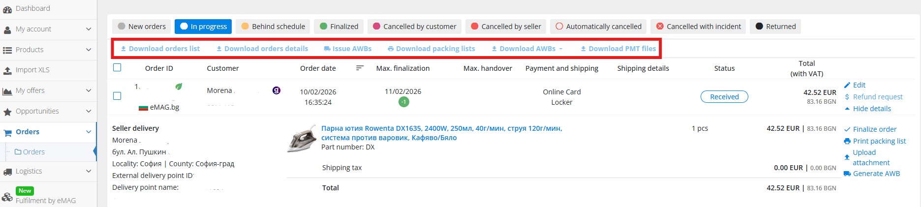Use the buttons from above the order list: Download orders list, Download orders details, Issue AWBs, Download packing lists, Download AWBs, Download PMT files if you want to quickly do the relevant actions for bulk orders.